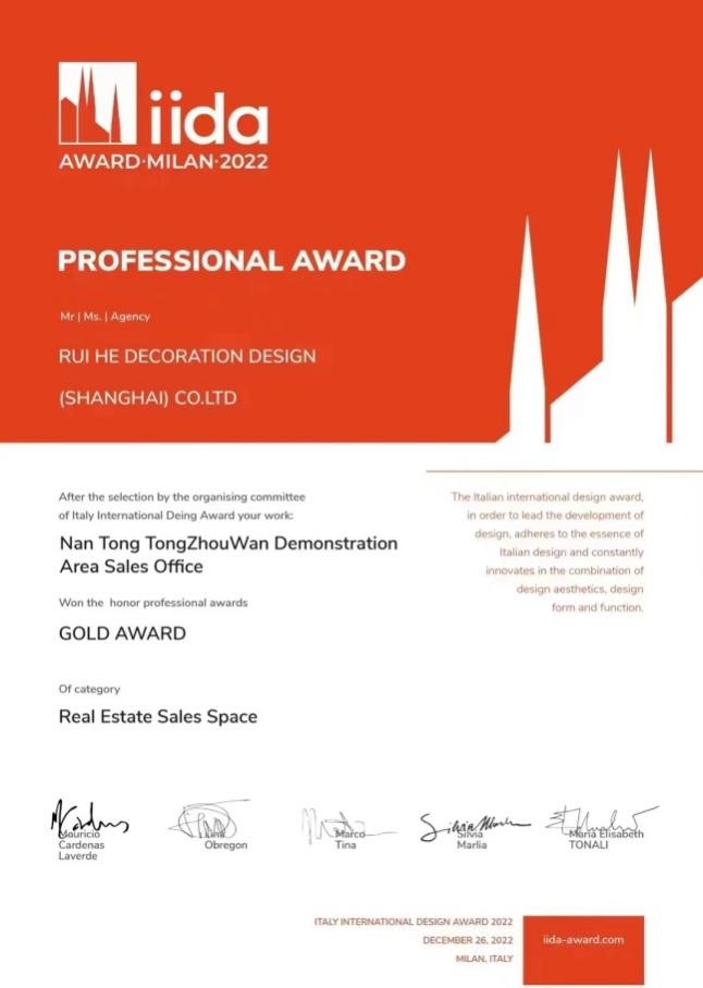 盛和房產(chǎn)通州灣灣上文華示范區(qū)售樓處設(shè)計方案榮獲2022意大利IIDA AWARD國際設(shè)計大獎地產(chǎn)售樓類金獎
