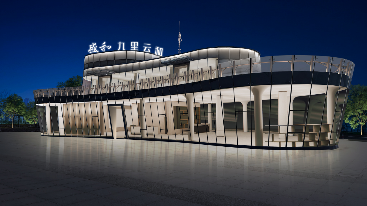 九里云和項目臨時售樓處坐落于通揚運河與通呂運河交匯處,總占地面積約460平方米,總建筑面積(含露臺)約880平方米。建筑內部布局有品牌沙盤區(qū)、會客區(qū)、露臺區(qū)等,滿足項目展示與活動舉辦需求。